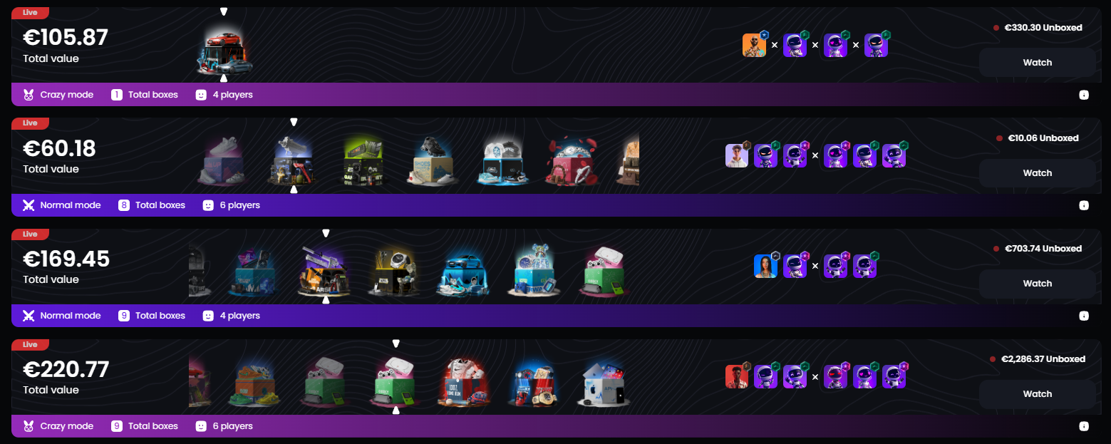 - 1 vs 1: Go head-to-head with another player. The person who gets the most valuable items takes everything, including what the other player unboxes.