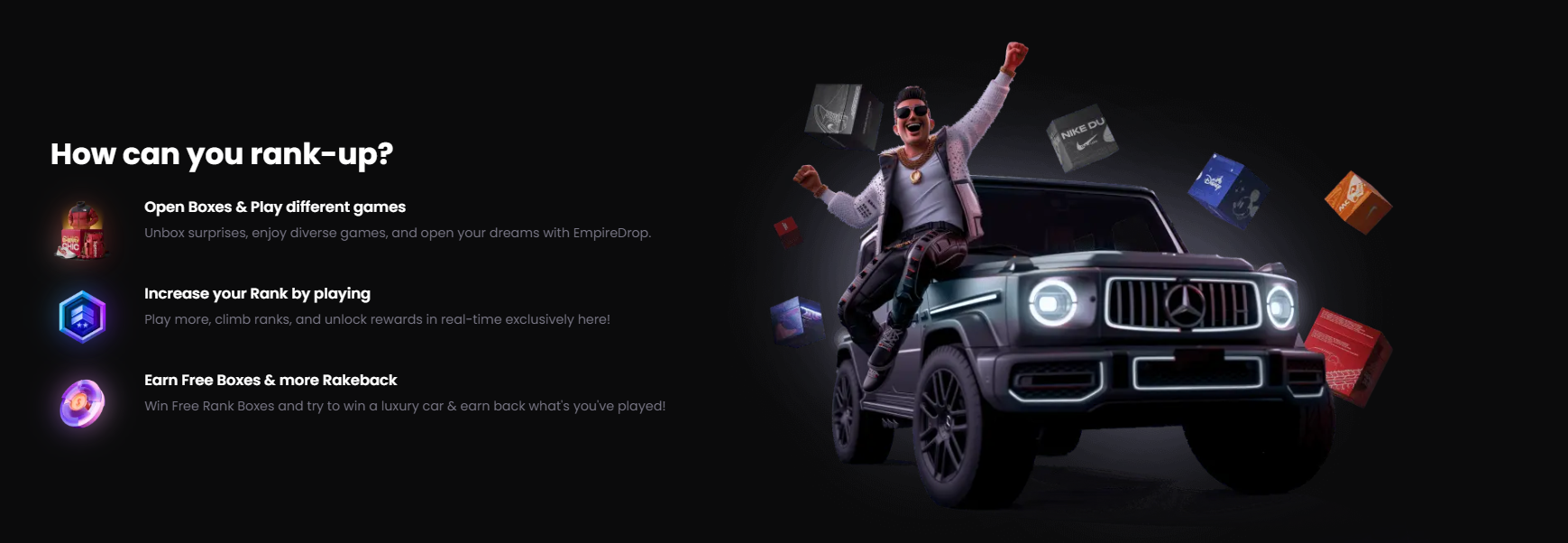 EmpireDrop’s VIP ranks (Bronze, Silver, Gold, etc.) offer perks like increased rakeback, free boxes, and exclusive bonuses as you play more. Leveling up can save you money and increase your chances of winning big.